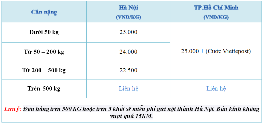 - Bảng giá: Áp dụng với hàng hoá phổ thông trên một đơn hàng, nhỏ nhất của một đơn hàng là 01 kg, Hải Phước Logistics bồi thường 5-7 lần cước vận chuyển, trong trường hợp hàng hoá thất lạc, không vượt quá giá trị hàng hoá ( không bồi thường với chất lượng hàng hoá). Hàng hoá giá trị cao xin liên hệ để được tư vấn trực tiếp.